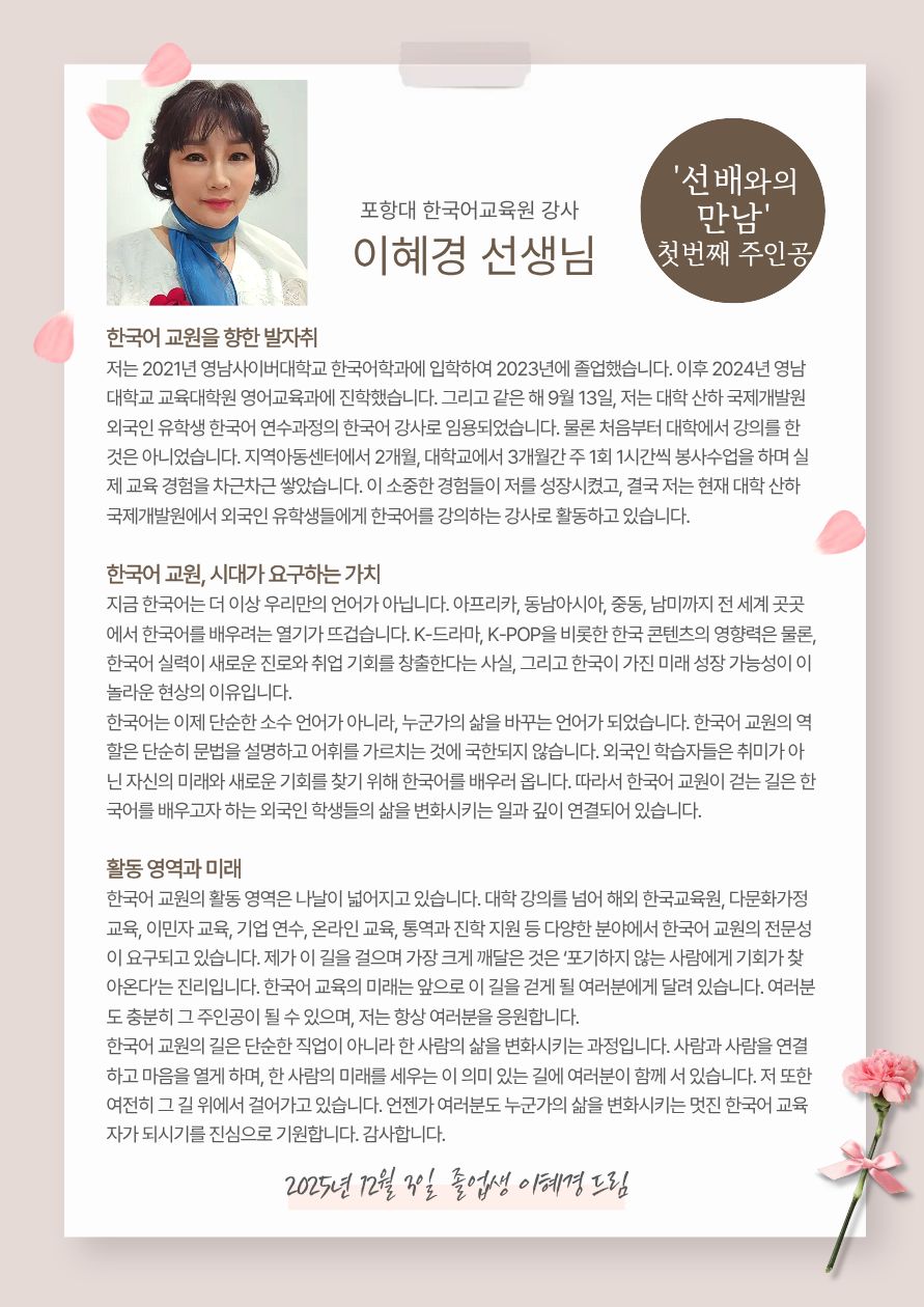 ¼±¹è¿ÍÀÇ ¸¸³²ÀÌ 11¿ù 27ÀÏ ZOOMÀ¸·Î ÁøÇàµÇ¾ú½À´Ï´Ù. ù¹øÂ° ¸¸³²À¸·Î Á¹¾÷»ý ÀÌÇý°æ ¼±»ý´Ô°ú ÇÔ²²ÇÏ¿´½À´Ï´Ù. Âü¿©ÇØÁֽŠºÐµé²² °¨»çµå¸³´Ï´Ù.